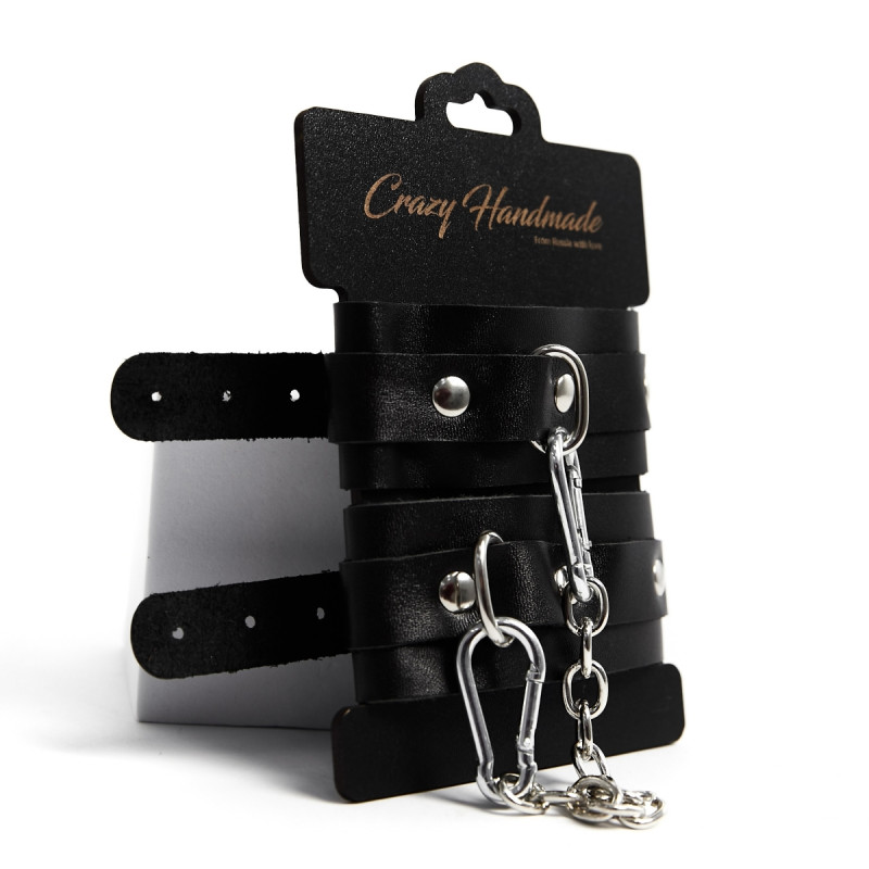 Кожаные наручники красного цвета.Ширина - 5 см. Украшены заклепками и соединяются между собой цепью с карабинами (длина цепочки - 15,5 см) Размер наручников регулируется при помощи застежки