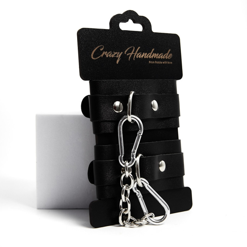 На оковах прочное хромированное овальное кольцо. В комплекте соединительная цепочка с двумя карабинами.