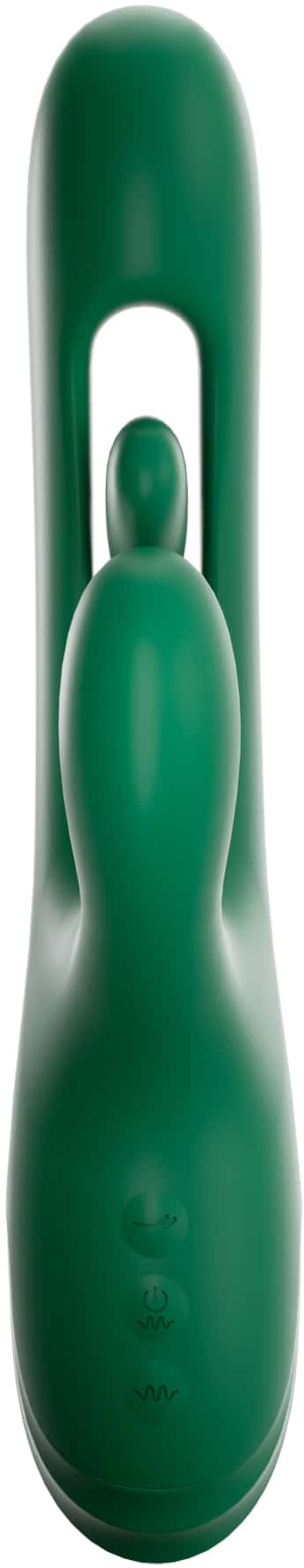 Верхняя кнопка отвечает за включение язычка в вагинальной части, нижняя за вибрацию в клиторальной частях, единоразовым нажатием на кнопку включения можно управлять стимуляцией в вагинальной части.